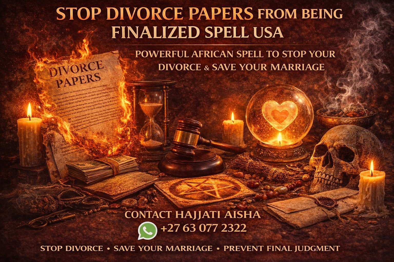 I am HAJJATI AISHA, a trusted AFRICAN SPELL CASTER, and many clients across the United States contact me when they want powerful spiritual help to stop divorce before the court finalizes it. My powerful STOP DIVORCE PAPERS FROM BEING FINALIZED SPELL is designed to remove negative influences affecting the relationship, weaken outside interference, and spiritually guide your partner back toward reconciliation before the divorce process is completed.