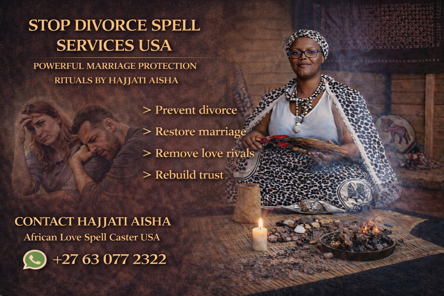 As Hajjati Aisha, a trusted African love spell caster helping clients across the United States, I perform powerful traditional African rituals designed to restore emotional attraction, stop divorce, and help couples rebuild their marriage.