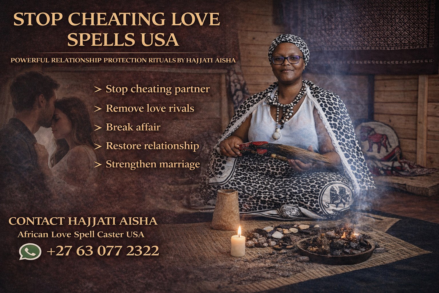Discovering that your partner is cheating can be one of the most painful and stressful experiences in a relationship. Many people contact me from Florida, California, Texas, New York, Chicago, and Atlanta when they suspect or discover that their partner is seeing someone else. They want the cheating to stop immediately and the relationship to return to loyalty and commitment. As Hajjati Aisha, I perform POWERFUL AFRICAN ANTI-CHEATING SPELLS designed to break outside relationships and restore faithfulness between partners.