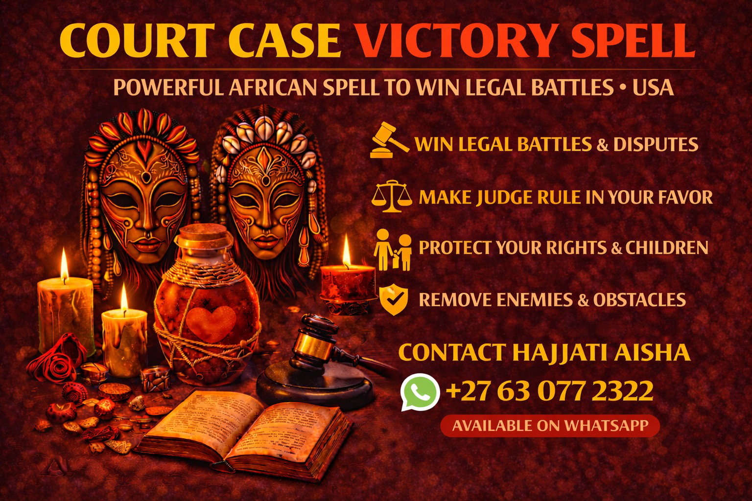 I am HAJJATI AISHA, a trusted AFRICAN SPELL CASTER, and many clients across the United States contact me when they need powerful spiritual assistance during difficult legal situations. My powerful COURT CASE VICTORY SPELL is designed to remove spiritual obstacles, weaken enemies influencing your case, and attract justice so that the judge rules fairly in your favour.