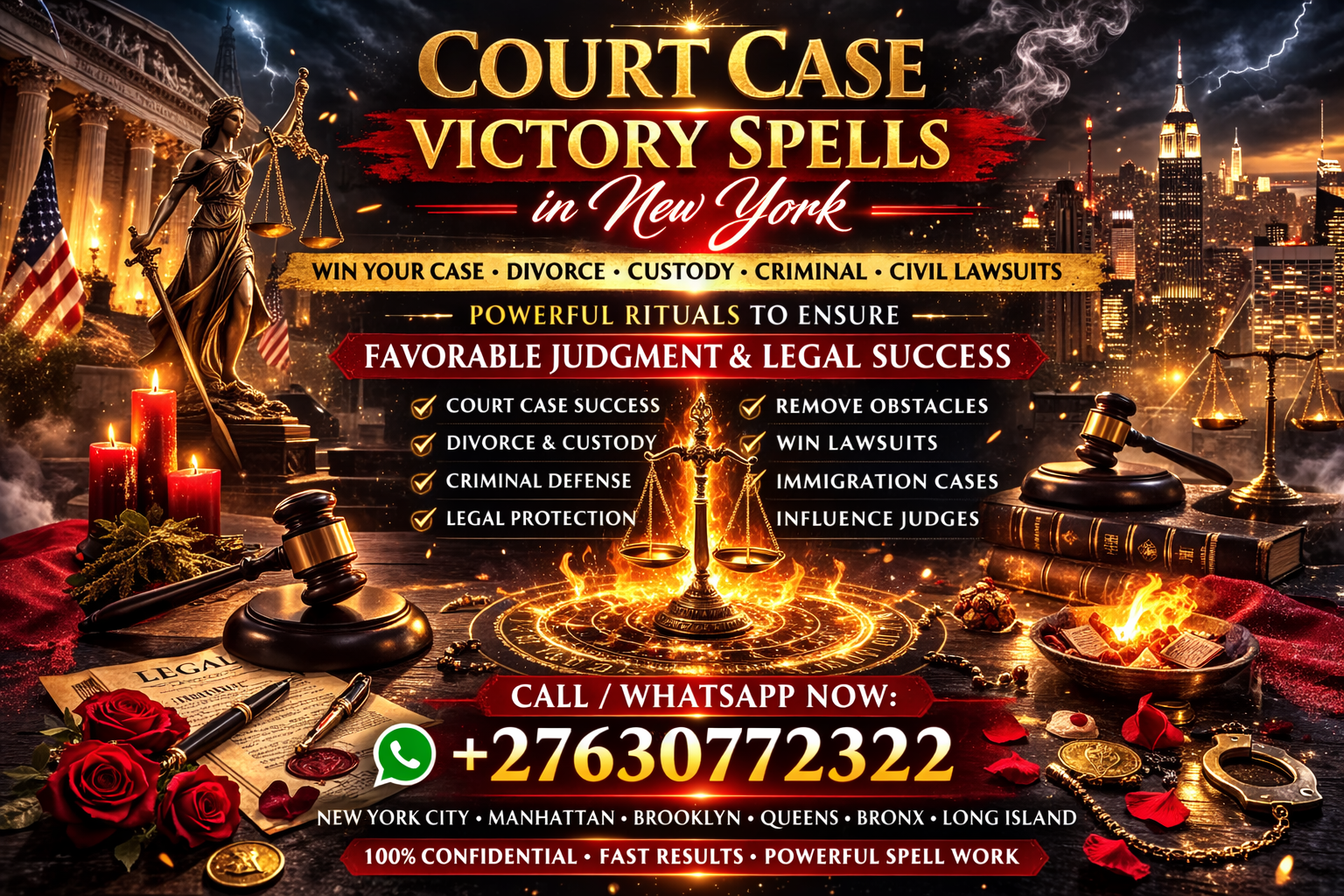 Legal battles in New York City, Manhattan, Brooklyn, Queens, Bronx, and Long Island can be emotionally exhausting and financially draining. Whether facing divorce court, child custody disputes, criminal charges, contract disagreements, immigration hearings, or civil lawsuits, the pressure of a pending judgment can create intense stress. Court case victory spells in New York focus on strengthening favourable outcomes, influencing positive decision energy, and reinforcing strategic advantage during legal proceedings.