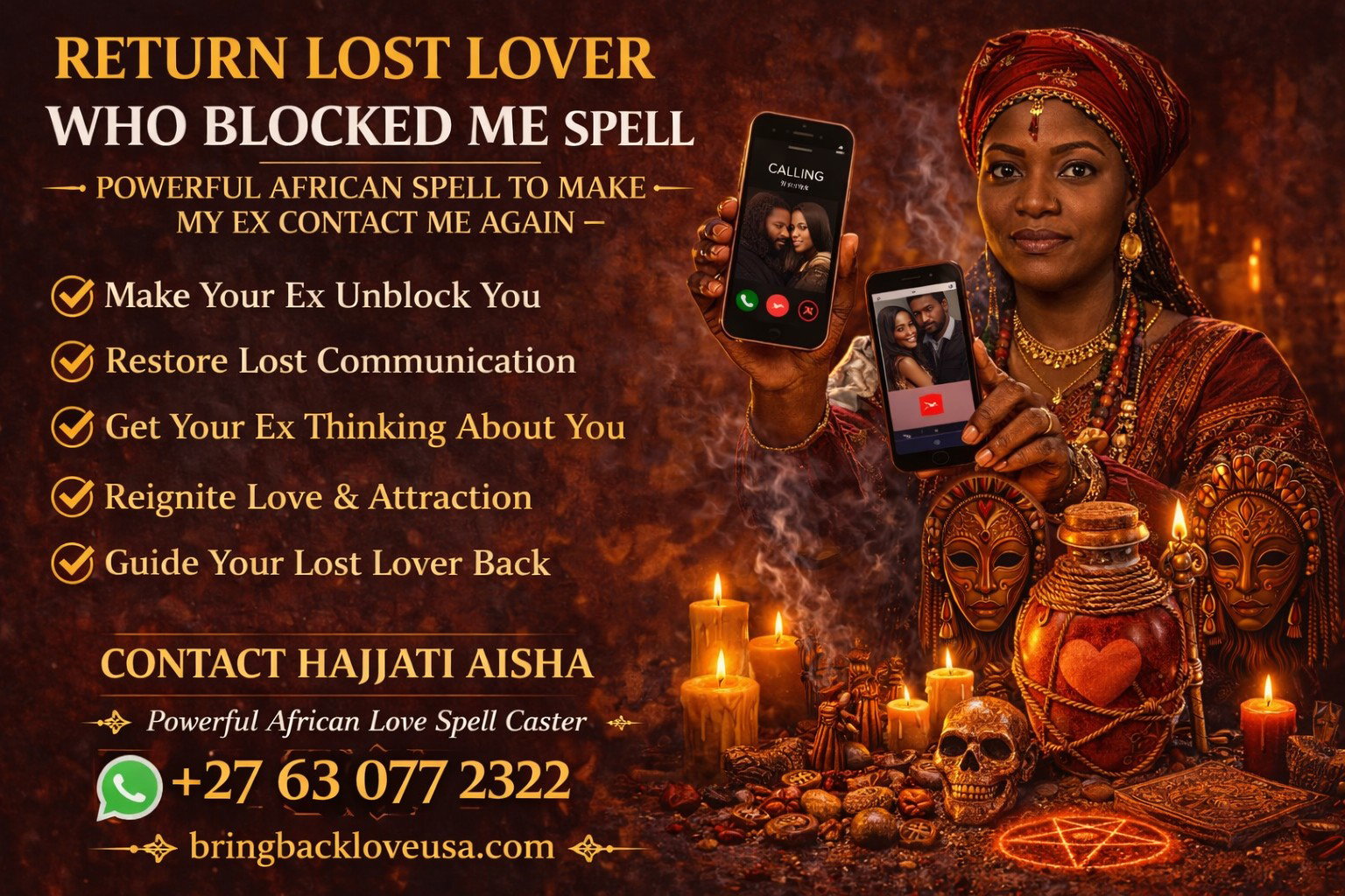 I am Hajjati Aisha, a trusted African love spell caster helping clients across the United States restore lost relationships and reopen communication with the person they love.