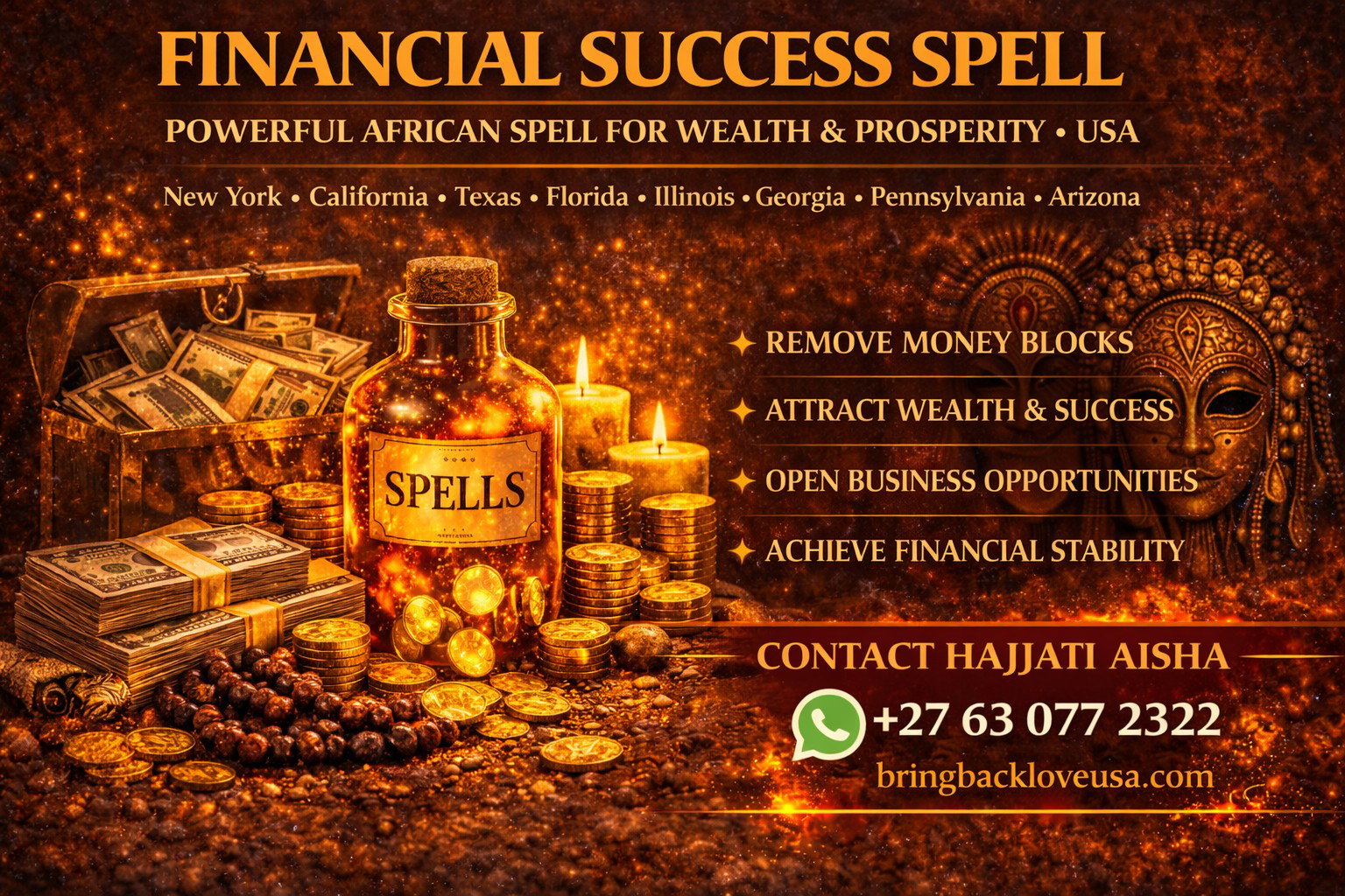 I am HAJJATI AISHA, a trusted AFRICAN SPELL CASTER, and many people across the United States contact me when they need powerful help attracting wealth, prosperity, and financial success. My powerful FINANCIAL SUCCESS SPELL is designed to remove money blockages, attract financial opportunities, and open powerful pathways that allow prosperity to flow naturally into your life.