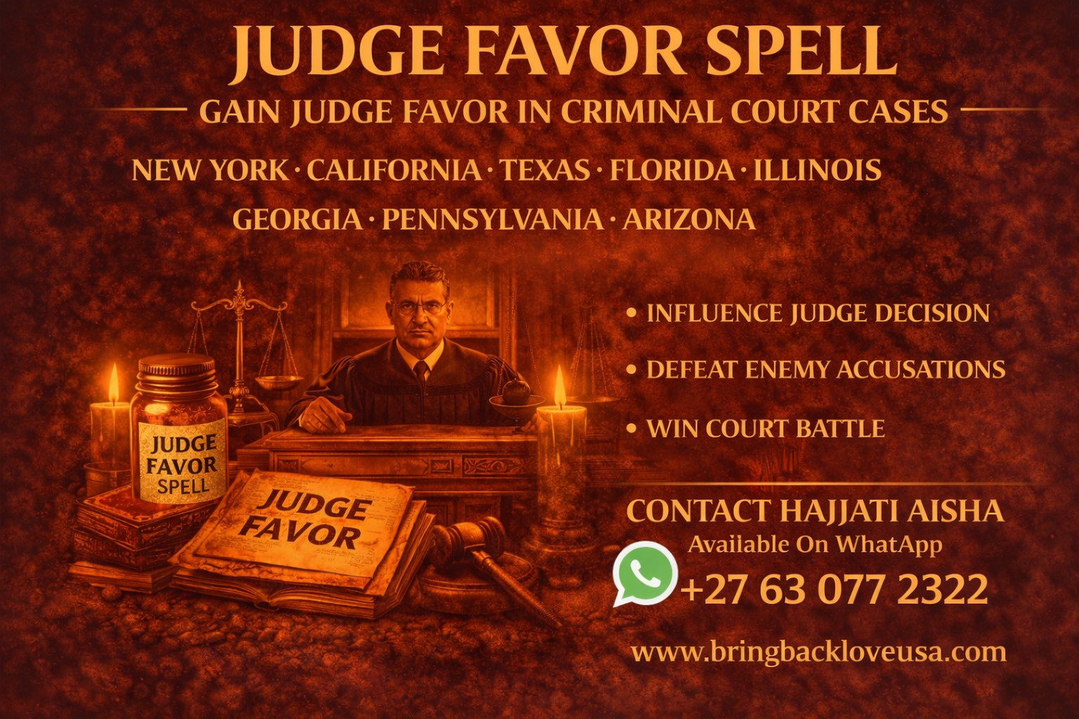 I am Hajjati Aisha, known by many clients across the United States as a powerful African spell caster who helps people overcome serious legal battles. Clients from New York, California, Texas, Florida, Illinois, Georgia, Pennsylvania and Arizona contact me when they need powerful spells to influence court situations and defeat enemies who are trying to destroy their lives through the legal system. My powerful African spells focus on removing negative forces, weakening enemy influence, and increasing the chances of receiving favourable court decisions.