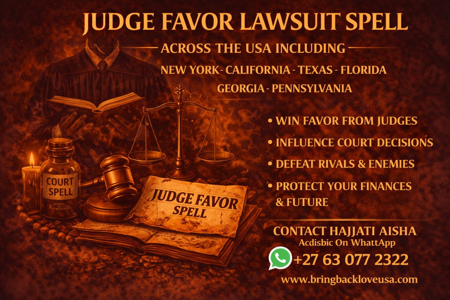I am HAJJATI AISHA, known across the UNITED STATES as one of the BEST AFRICAN SPELL CASTERS performing powerful COURT CASE AND LAWSUIT SPELLS. Clients from NEW YORK, CALIFORNIA, TEXAS, FLORIDA, ILLINOIS, GEORGIA and PENNSYLVANIA contact me when they fear their enemies are trying to manipulate the legal system against them.