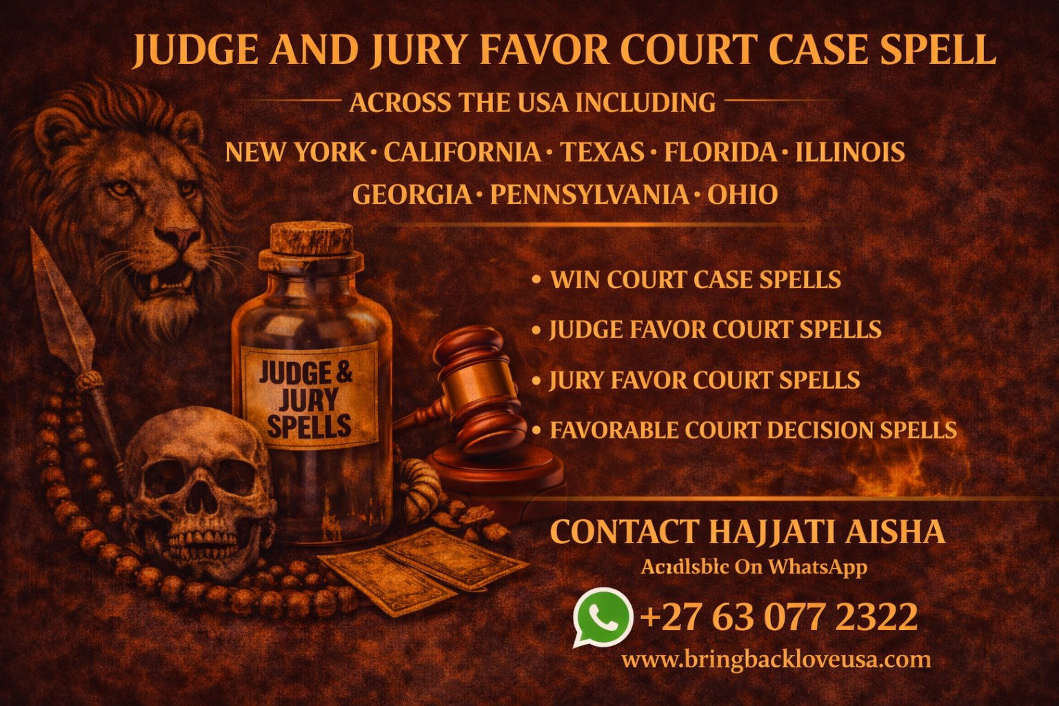 I am Hajjati Aisha, widely known by clients across the United States as the NO.1 trusted African spell caster, real spiritual worker, and result-focused practitioner helping people overcome serious life challenges. Through powerful traditional African spiritual rituals, I help remove spiritual obstacles surrounding legal battles and strengthen the path toward fair decisions in court. Clients from NEW YORK, LOS ANGELES, MIAMI, HOUSTON, ATLANTA, CHICAGO, DALLAS, PHOENIX, SAN DIEGO, ORLANDO and many other major cities across the United States contact me when they need powerful spiritual intervention during serious legal disputes.