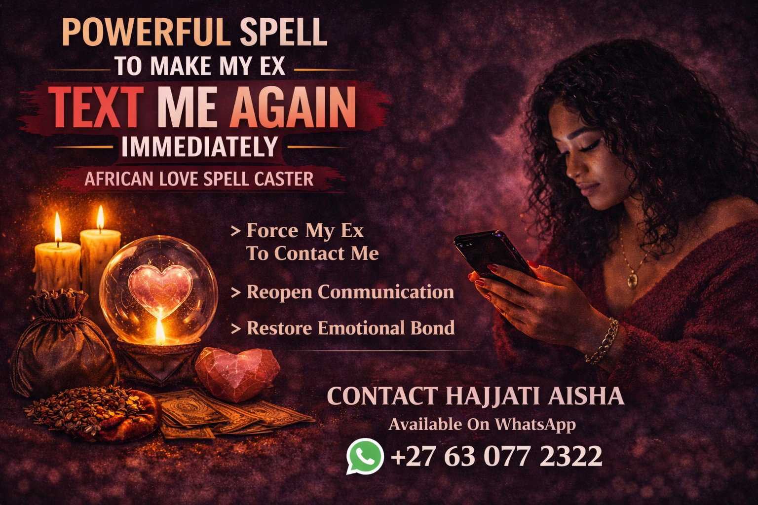 I am Hajjati Aisha, a powerful African love spell caster helping clients across the United States bring their ex back and restore broken relationships. When an ex suddenly stops texting, ignores your messages, or blocks communication, I perform Make My Ex Text Me Spells, Bring Back Ex Love Spells, and Return Lost Lover Rituals designed to force communication to reopen and bring your partner back