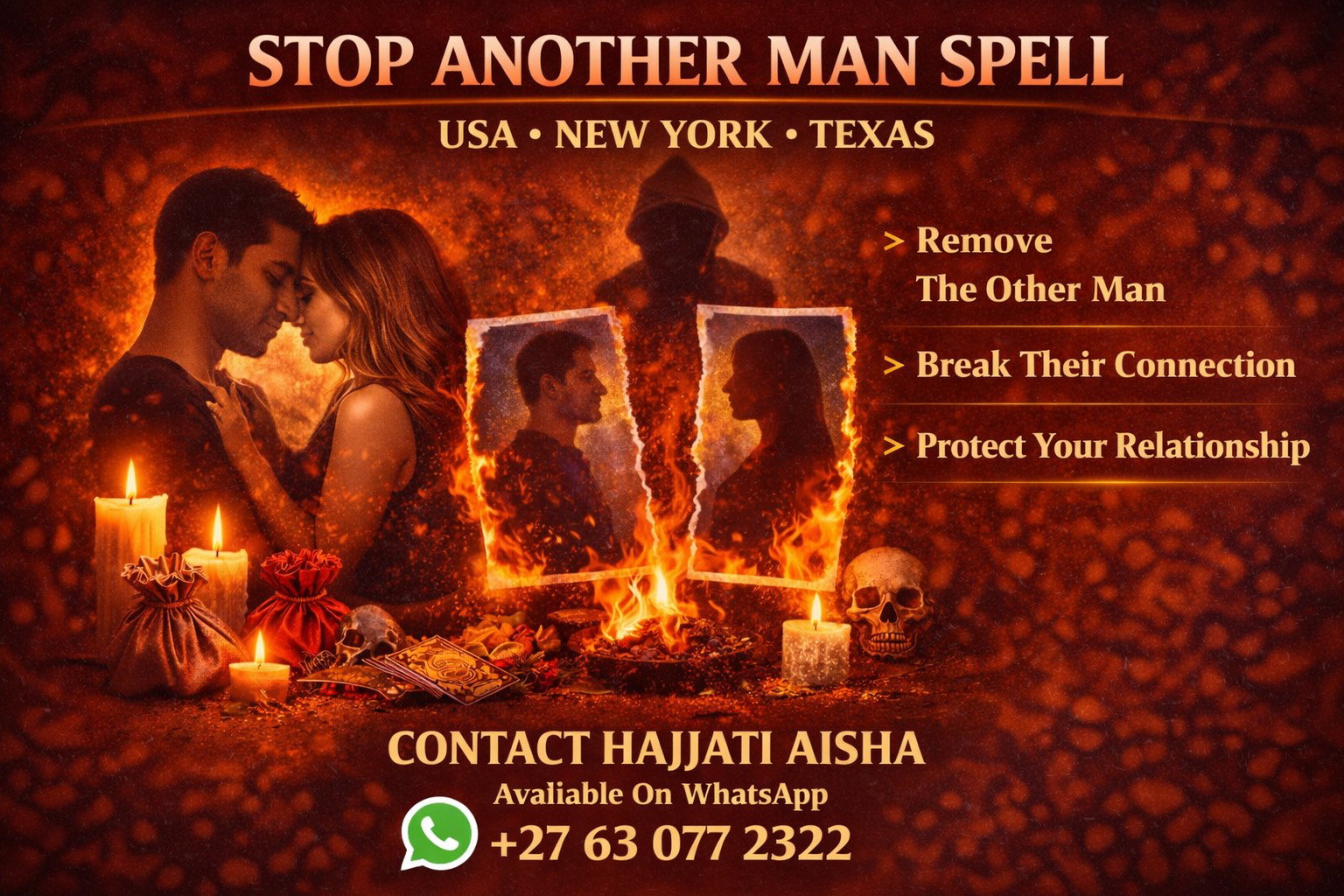 My ritual work focuses on STOP ANOTHER MAN SPELLS, REMOVE LOVE RIVAL SPELLS, BREAK AFFAIR SPELLS, AND MARRIAGE PROTECTION SPELLS designed to separate your wife from outside relationships and rebuild emotional commitment within your marriage. Many clients across Los Angeles, Houston, Miami, Chicago, and New York City contact me when they want to remove another man interfering in their relationship.