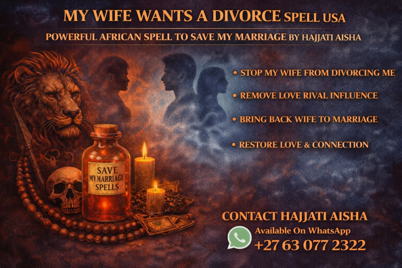 I am Hajjati Aisha, a trusted African love spell caster, and many people across the United States contact me when they want powerful spiritual help to save their marriage before divorce becomes permanent.