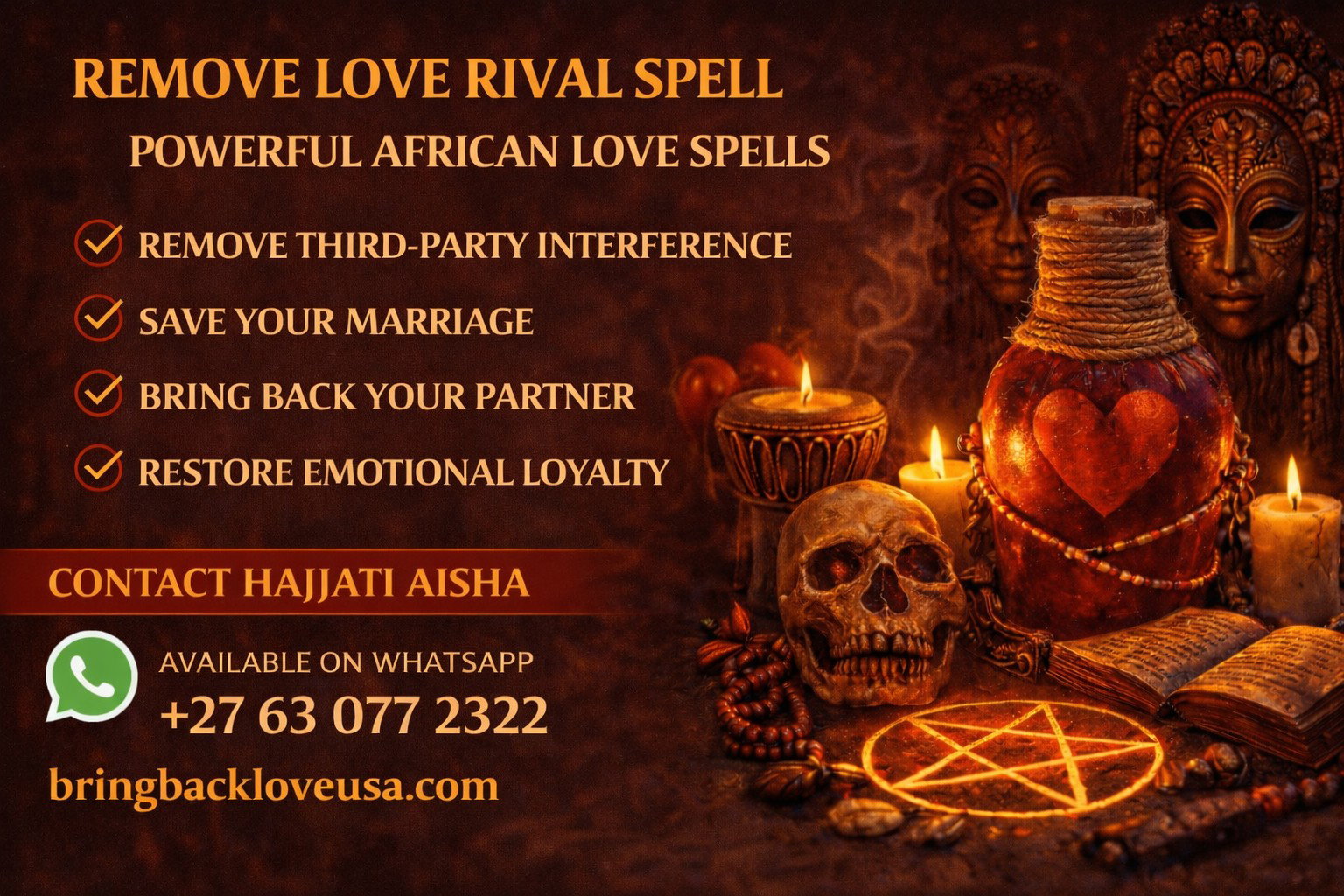 When clients contact me, my work focuses on removing the third person influencing the relationship and restoring emotional attraction between partners. Through powerful traditional rituals I perform LOST LOVE SPELLS, BRING BACK LOST LOVE SPELLS, RETURN MY EX SPELLS, STOP CHEATING SPELLS, STOP DIVORCE SPELLS, SAVE MY MARRIAGE SPELLS, REMOVE LOVE RIVAL SPELLS, RESTORE LOVE AND ATTRACTION SPELLS, BREAK THIRD PARTY RELATIONSHIPS, REUNITE SEPARATED COUPLES, GAY LOVE SPELLS, SAME-SEX RELATIONSHIP RECONCILIATION SPELLS, helping couples rebuild loyalty and emotional attraction. Many people experiencing cheating or relationship interference also read https://www.bringbackloveusa.com/blog/real-love-spells-that-work-hajjati-aisha to understand how powerful rituals help reunite couples.
