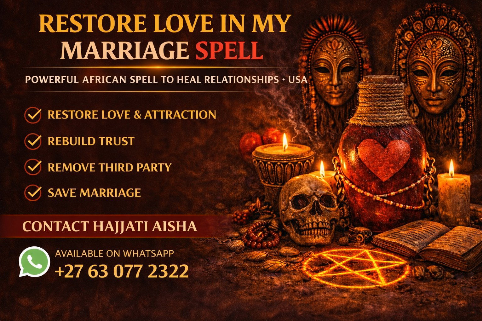 A powerful restore love in my marriage spell focuses on rebuilding emotional attraction, healing negative energy affecting the relationship, and restoring the spiritual connection between partners. These African spiritual rituals help strengthen love, rebuild trust, and encourage emotional closeness between husband and wife.