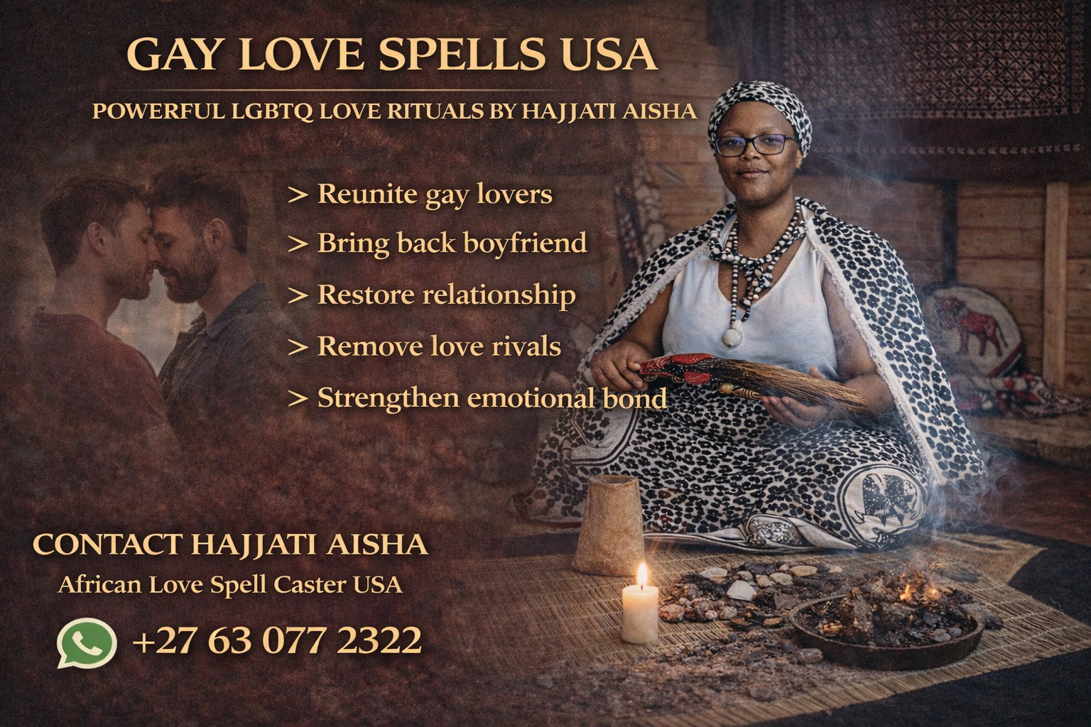 As Hajjati Aisha, a trusted African love spell caster helping clients across the United States, I perform powerful traditional rituals designed to restore emotional attraction and help same-sex partners reconnect and rebuild their relationships.