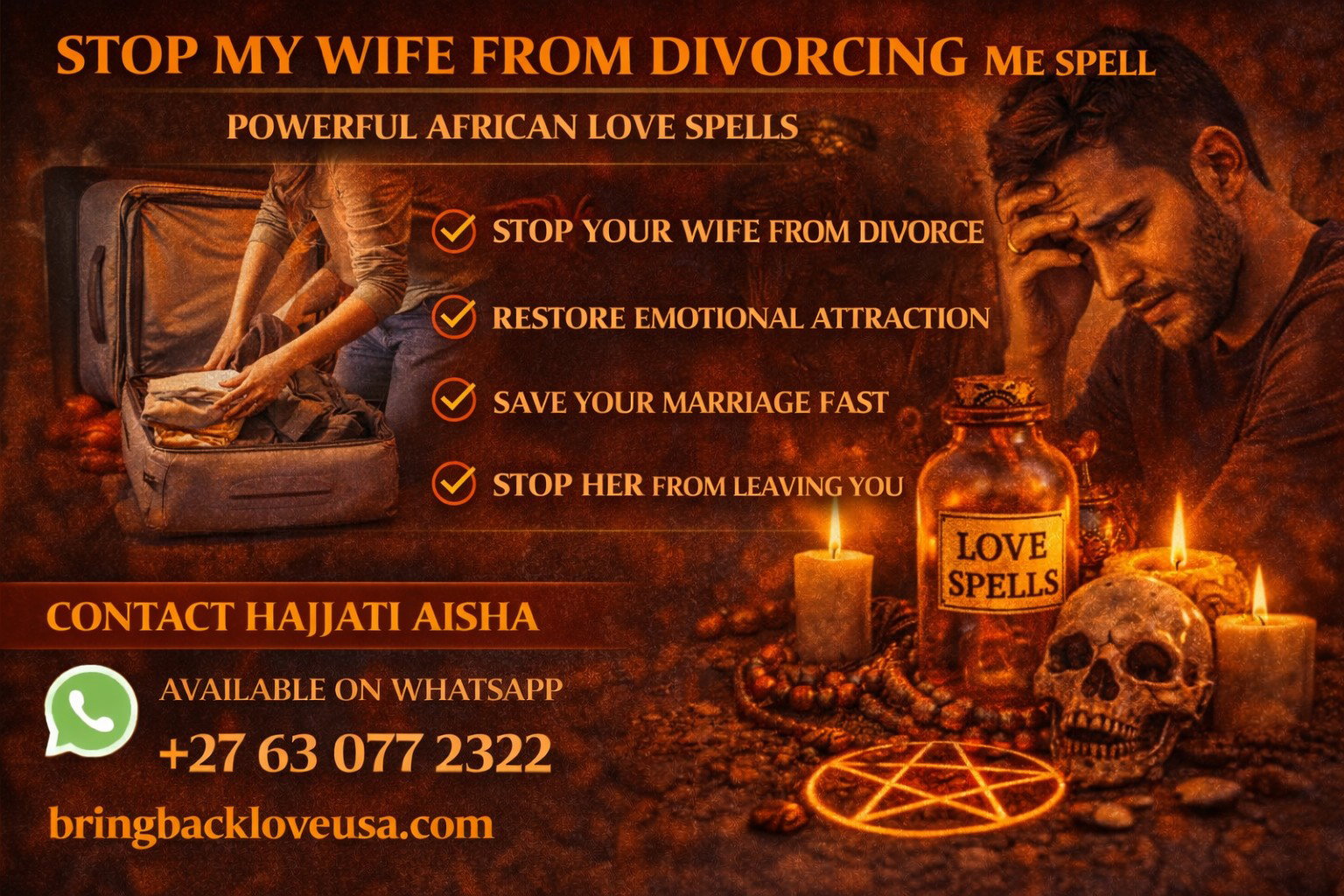 A powerful stop my wife from divorcing me spell focuses on restoring emotional connection, calming relationship conflict, and rebuilding the love that once existed in the marriage. African spiritual rituals are used to strengthen the emotional bond between partners, remove negative influences affecting the relationship, and encourage reconciliation before divorce becomes final.