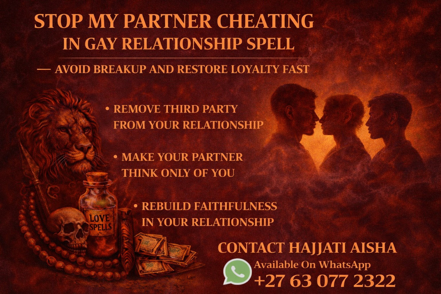 A powerful STOP MY PARTNER CHEATING IN GAY RELATIONSHIP SPELL focuses on removing third-party influence, restoring emotional attachment, and rebuilding loyalty. These African rituals are designed to break negative connections and strengthen your bond.