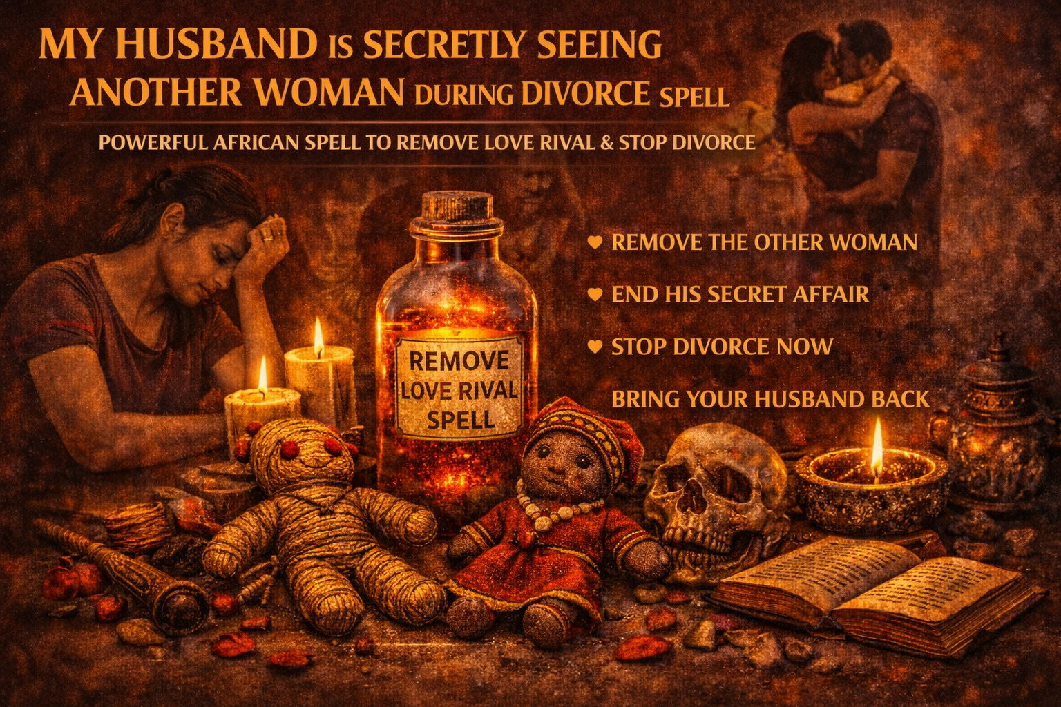 My MY HUSBAND IS SECRETLY SEEING ANOTHER WOMAN DURING DIVORCE SPELL is performed using powerful African spiritual rituals designed to: