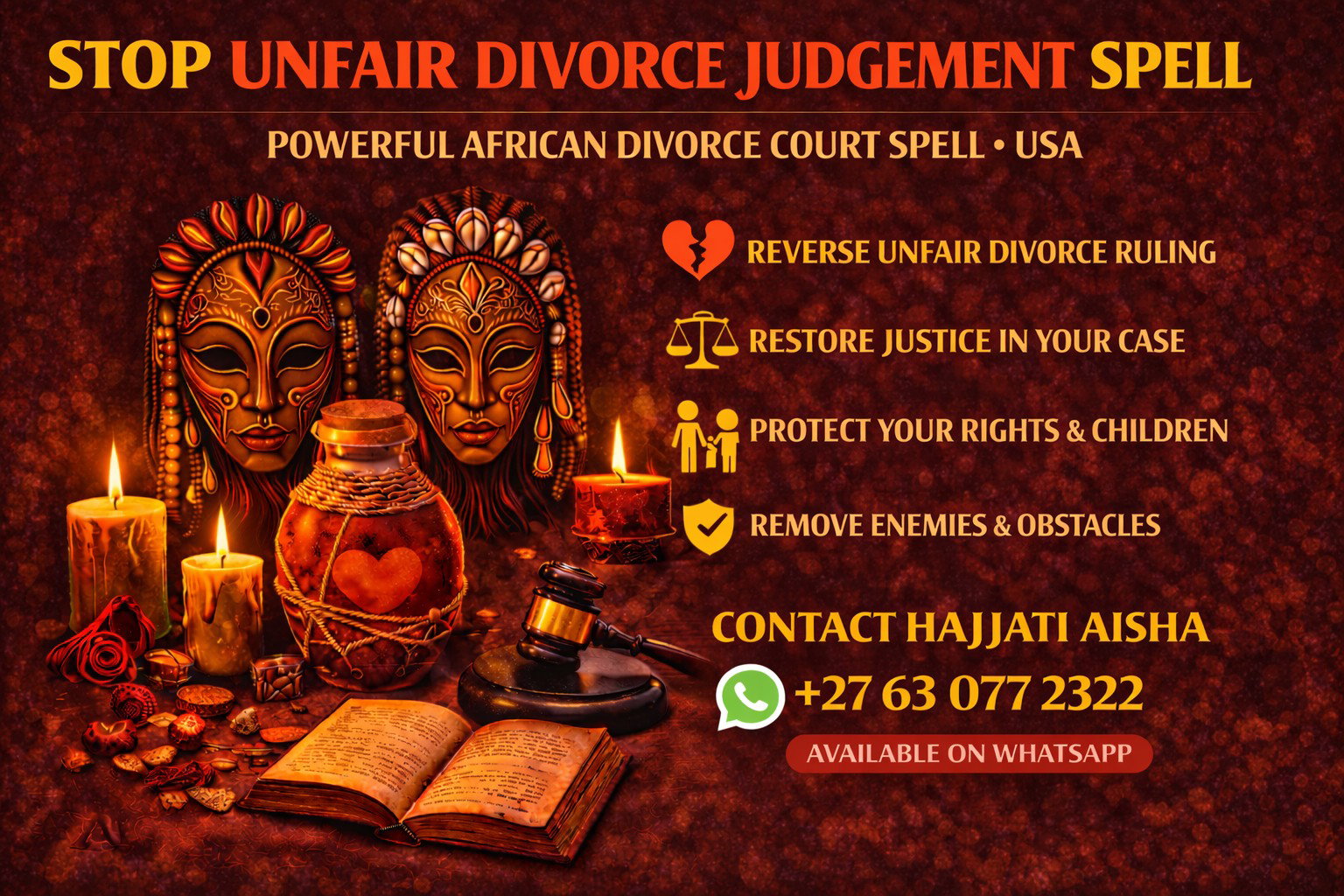I am HAJJATI AISHA, a trusted AFRICAN SPELL CASTER, and many clients across the United States contact me when they need strong spiritual assistance during legal disputes. My powerful STOP UNFAIR DIVORCE JUDGEMENT SPELL is designed to remove negative influences surrounding your court case, restore balance, and help attract justice during divorce proceedings.
