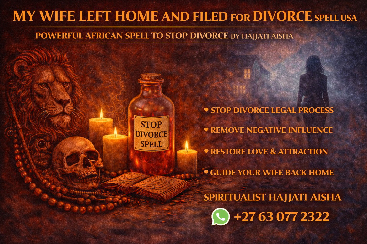 I am Hajjati Aisha, a trusted African love spell caster, and many clients across the United States contact me when their wife has already left home and filed for divorce but they still want to restore their marriage.