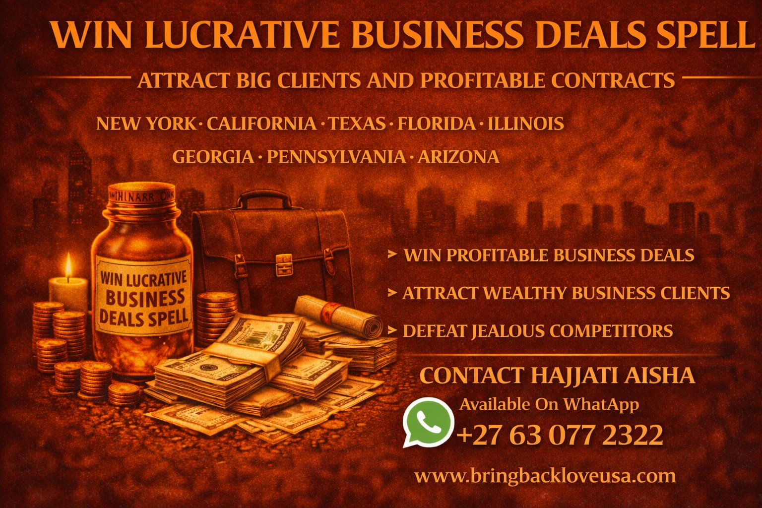 Clients from Los Angeles, Chicago, Dallas, Houston, Miami, Atlanta, Philadelphia and Las Vegas contact me when they want powerful spells that attract big financial deals, powerful investors, and profitable business opportunities.