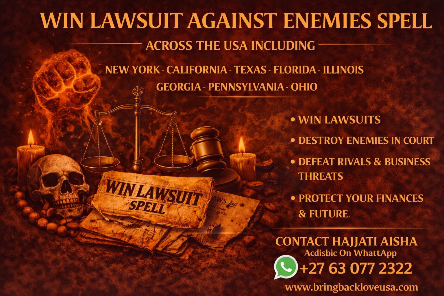 When someone feels overwhelmed by a legal battle, they begin searching for POWERFUL SPELLS TO WIN A LAWSUIT AND DEFEAT THEIR ENEMIES.I am HAJJATI AISHA, known across the UNITED STATES as one of the BEST AFRICAN SPELL CASTERS performing powerful COURT CASE AND LAWSUIT SPELLS. Clients from NEW YORK, CALIFORNIA, TEXAS, FLORIDA, ILLINOIS, GEORGIA and PENNSYLVANIA contact me when they feel their enemies are trying to destroy them through the legal system.
