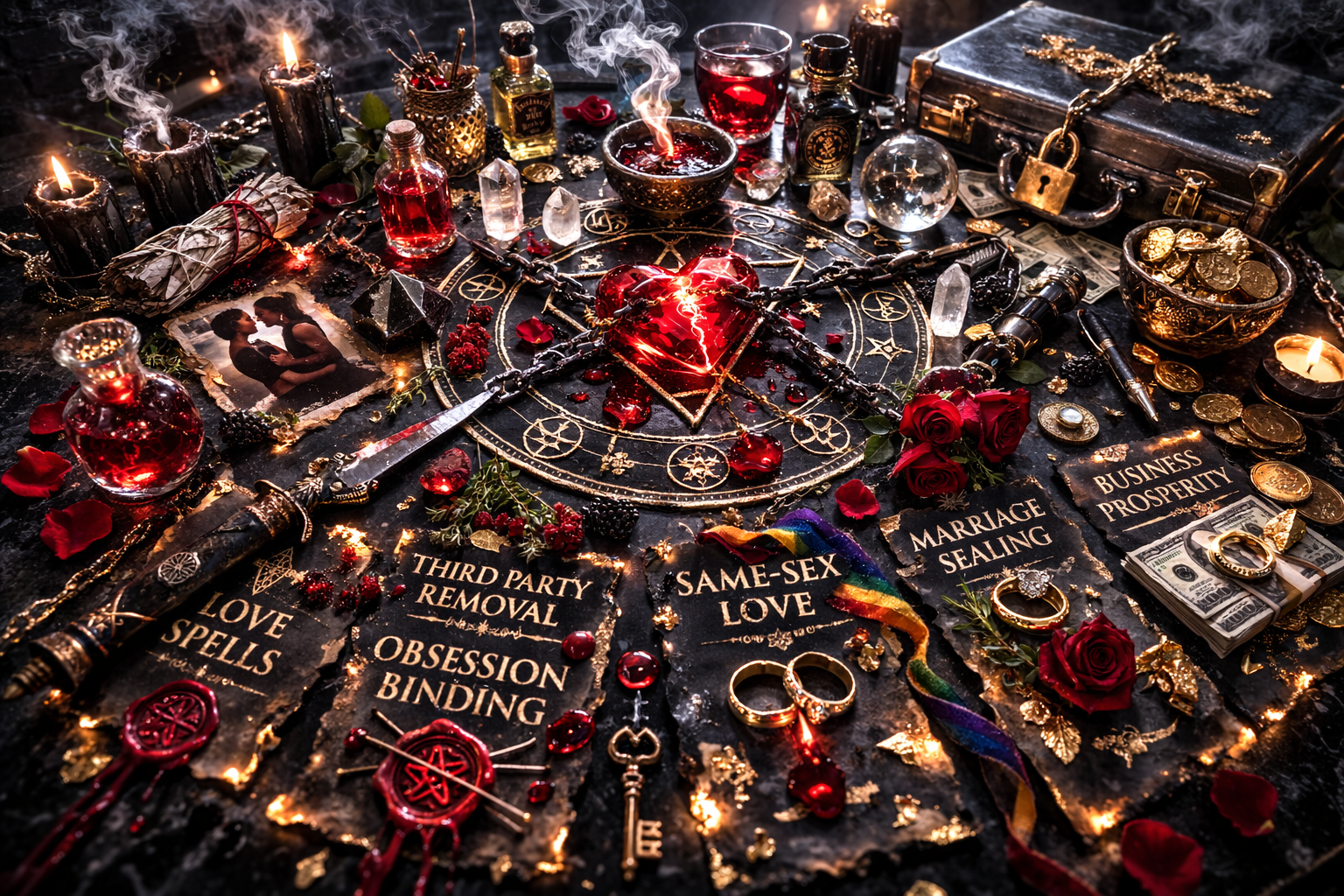 Authentic voodoo love spells, marriage binding rituals, passion work, and obsession spells designed to return lost love and deepen emotional attachment.
